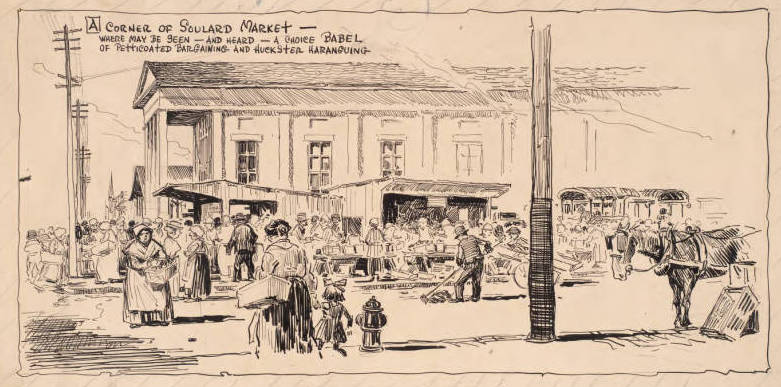 Perhaps the best representation of the old Soulard market hall is a World War I-era ink drawing by Archibald B. Chapin, published in the St. Louis Republic. In the foreground, the fishmonger’s stand figures prominently; the market shed peeks out from behind the market hall. The spire of Ss. Peter and Paul Church is visible in the background.