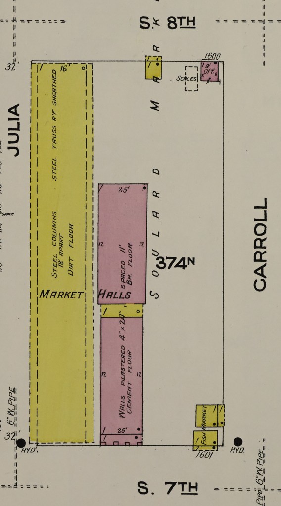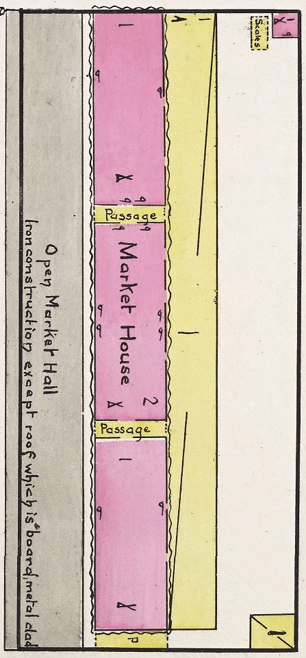 Rebuilding and repairs went quickly. Less than a year after the tornado, the market hall was up and running again. It now consisted of not three but “two buildings, each 32 by 60 feet, placed end to end and separated by a brick-paved passage which permits traffic to cross the lot to the wagon shed south of the buildings. Both buildings are of brick with metal roofs. The one facing seventh street, which is the main entrance, contains a middle passage with stalls on each side, the division between which is indicating by a number of wooden box posts extending from the floor to the ceiling.”[12] The rebuilt building behind it –which before had been the middle building–was now only one story, and the roof of both buildings was the same height.
