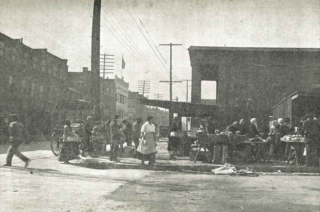 Even so, the market hall’s long-term viability was threatened by vendors’ preference for the cheaper spaces outdoors and by an increasing number of grocery stores in the neighborhood. In 1902 and 1903, municipal officials proposed using the hall as a public bathhouse, but nothing came of it, because contractors never submitted an acceptable bid; the bathhouse instead opened in 1909 on the other side of Seventh Street, across from the market hall. In 1910, one national periodical lamented the dismal state of the market hall, foreshadowing the criticism of the aging structure that would eventually lead to its replacement. “It is the least sanitary of the city markets and the least remunerative. But four stalls are now rented, and these do not have an attractive appearance.”[15]