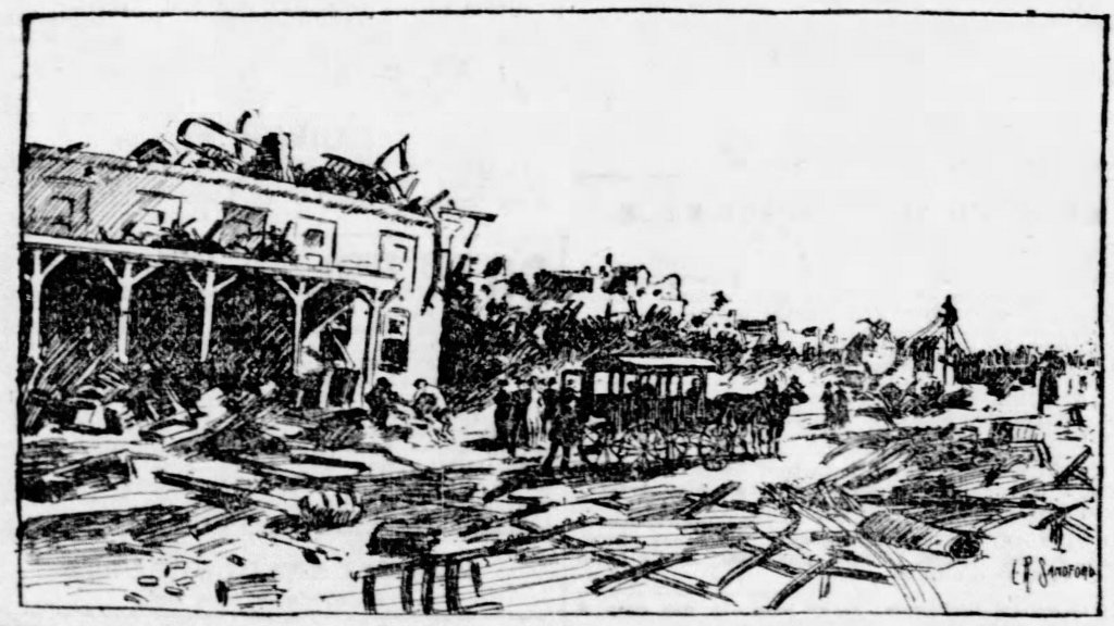 When the 1896 tornado struck, the sheds were largely unscathed, protected from the full force of the twister by the brick market hall that was just a few feet to the north. Moving eastward, the tornado nearly leveled the western two thirds of the market hall. The lean-to covering, where several bystanders had taken shelter, was likewise destroyed. However, the eastern third of the building—the oldest part of it—remained largely intact, its four brick pillars in the front somehow withstanding the force of winds that reached speeds in excess of 160 miles per hour.